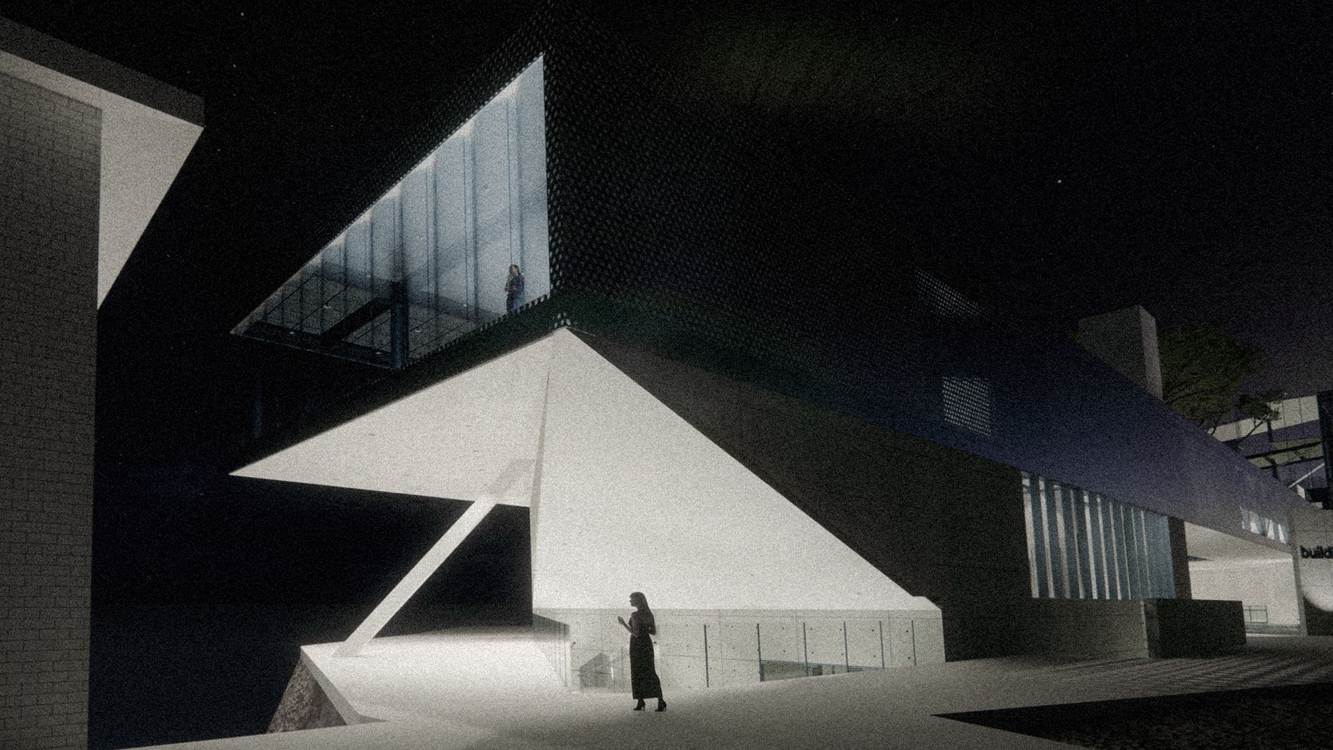 [01] Exterior night view of the building's north side. Ramps lead down to the entry plaza.