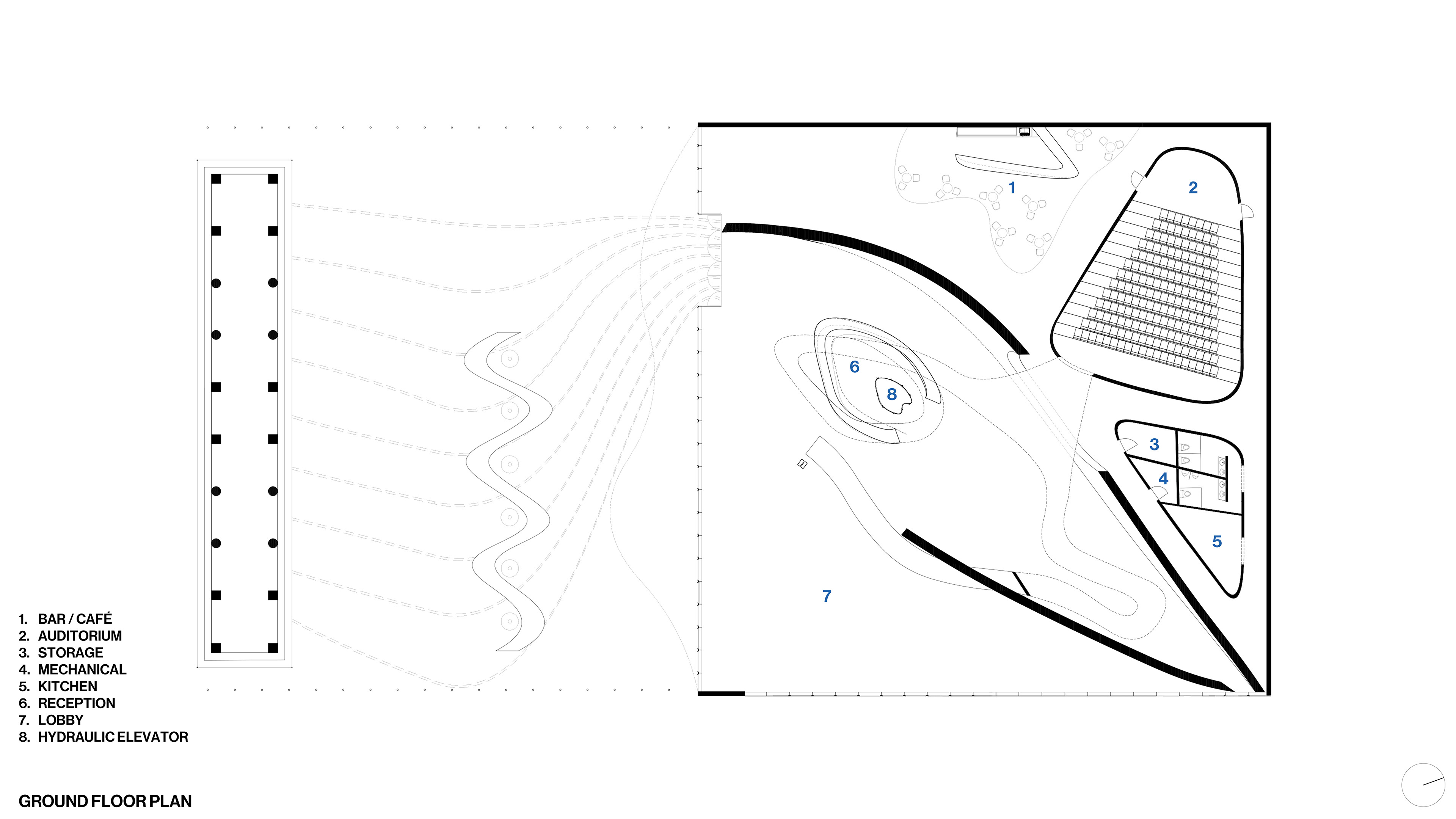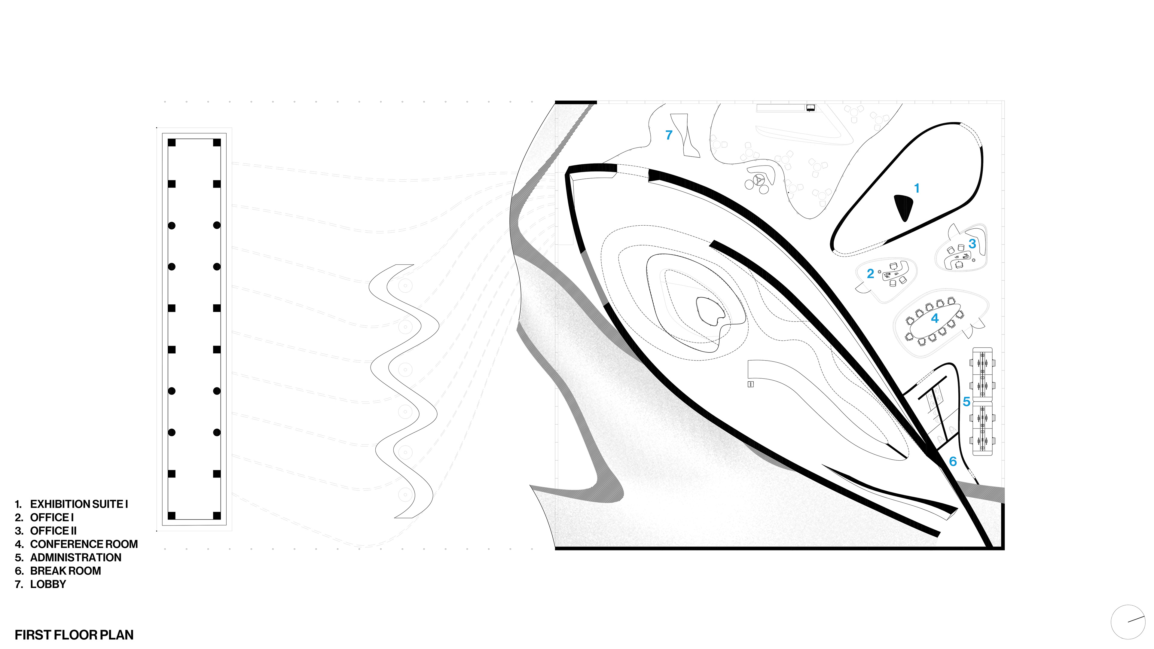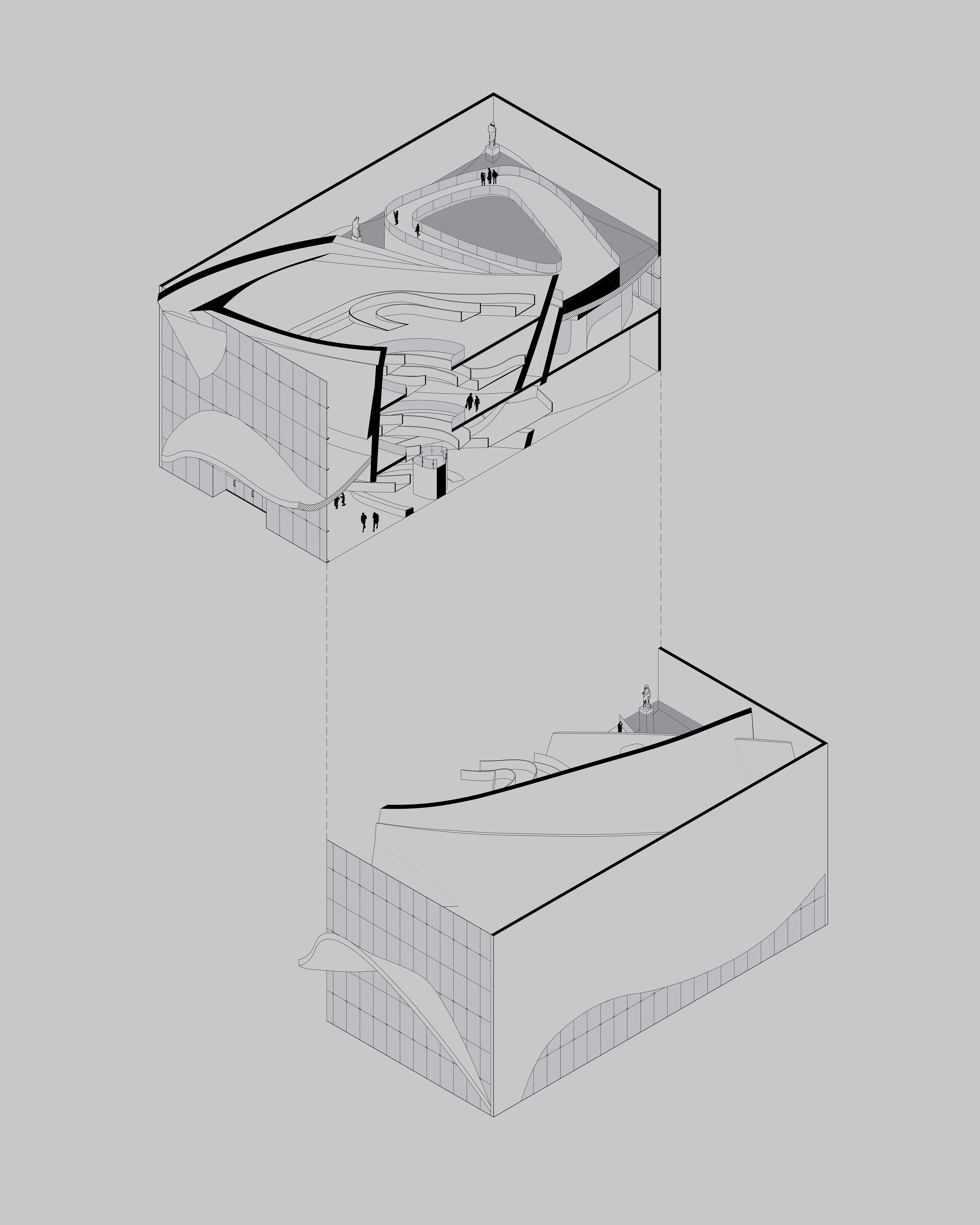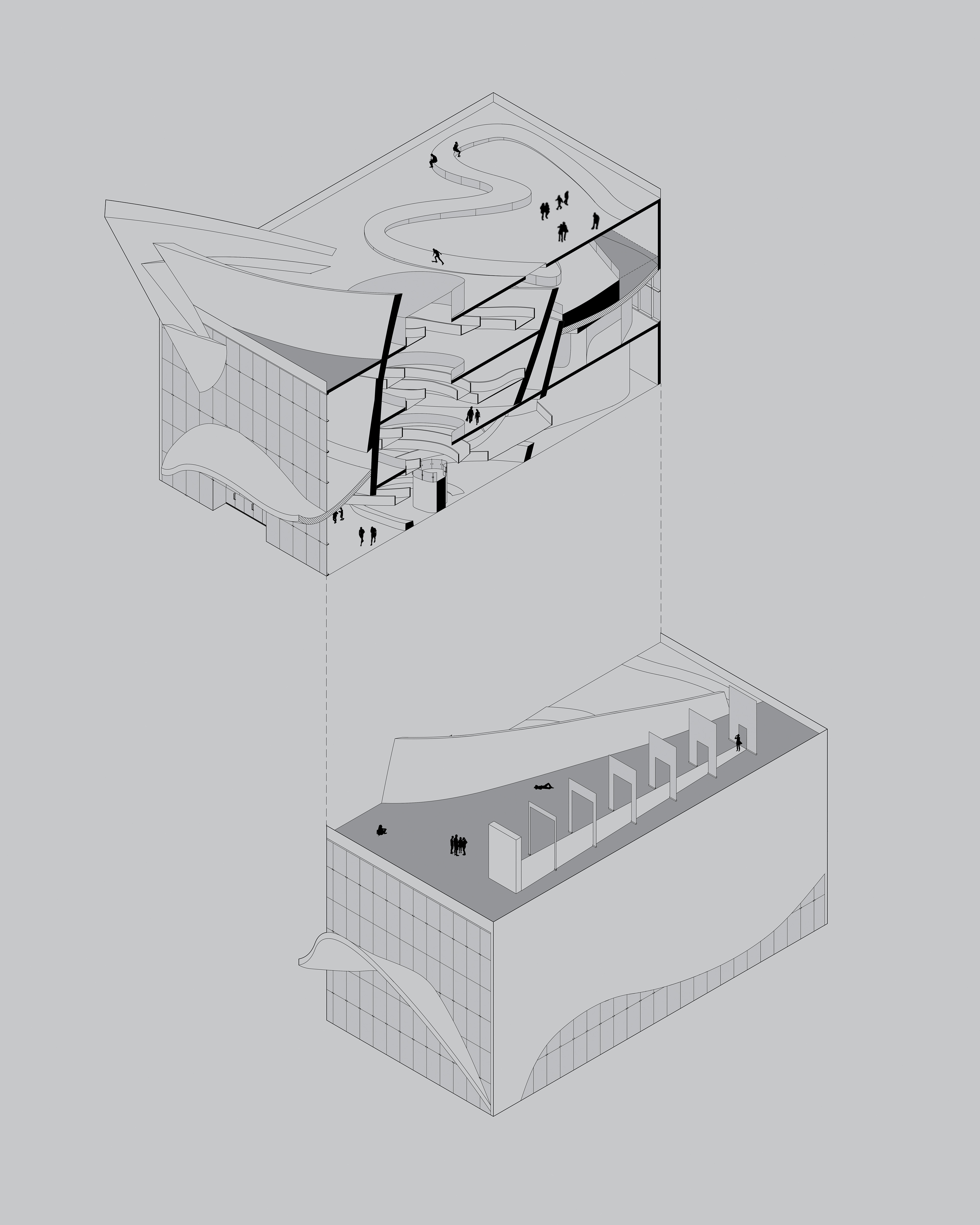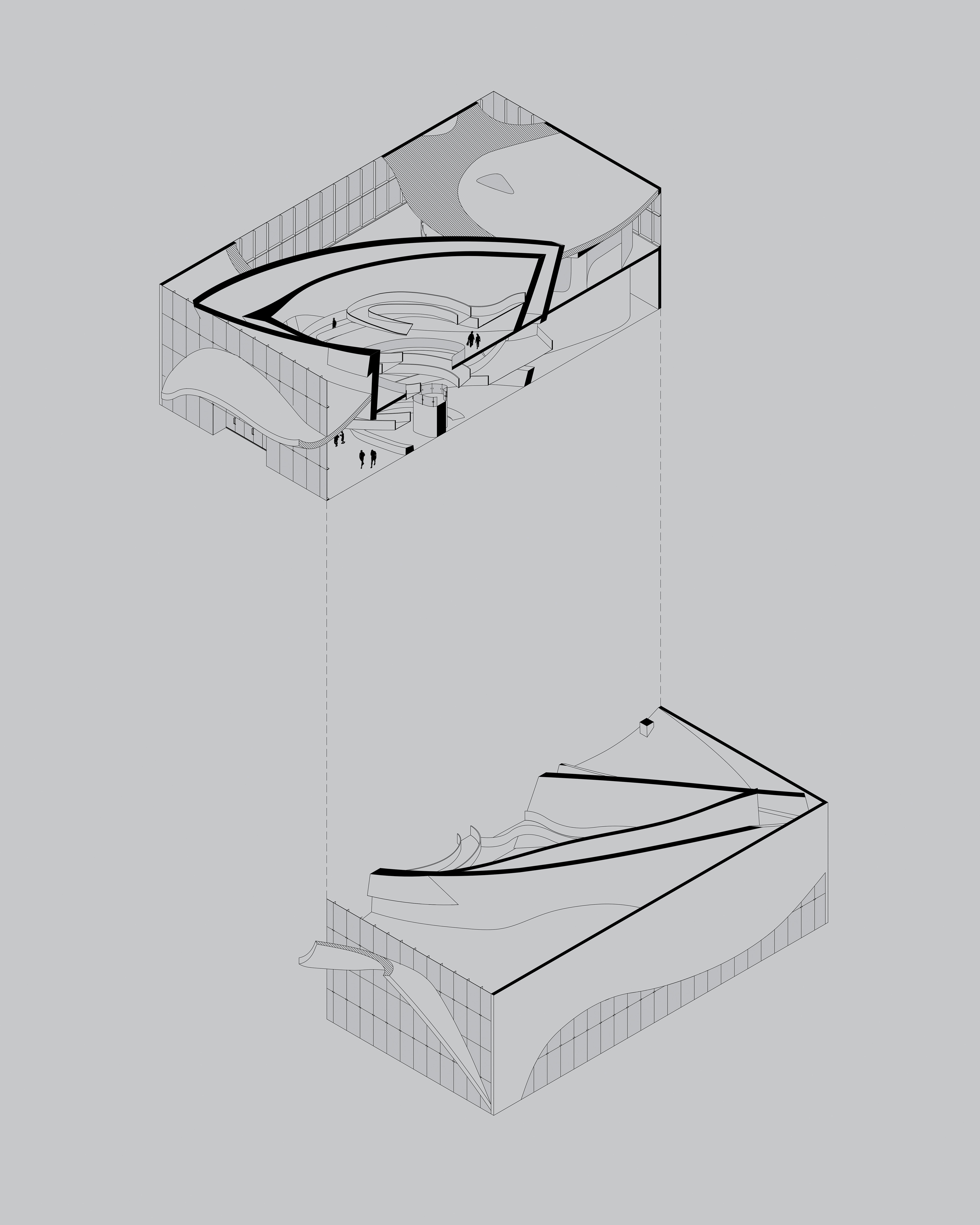 Considering the site, perhaps the most notable attraction that the Piazza dei Ciompi offers is the Loggia del Pesce. Roughly translated to "fish lodge", this market informs the design choices of this museum which can be divided into three major forms: the fish, the wave, and the tank. The fish is the magnet of this museum, pulling visitors deep into the belly of the building where all vertical circulation occurs. Movement from one floor to the next is through a series of ramps that resembles intestines spreading themselves across the floor. The fish itself is an explosive force, piercing through walls and floors and deconstructed in a way that recalls the early works of Gehry. A hydraulic elevator à la Louvre takes the form of the atrium in which it moves through. The shape of the atrium is based literally off the fish, which combined with the ventricle forms the heart of the fish. In the same manner that a heart acts a central point for the circulation of blood, the heart-shaped atrium allows for human circulation. Auxiliary elements often take the form of a fin: a rounded, misshapen triangle. Where the fish imposes and informs, the wave is a form that is more ambiguous and cohesive. Its form is elusive: it is a ceiling, a floor, a canopy. The final element—the tank—acts as a mediator, a simple orthogonal volume that introduces parametric forms without disrupting the linear rigidity of the city.
